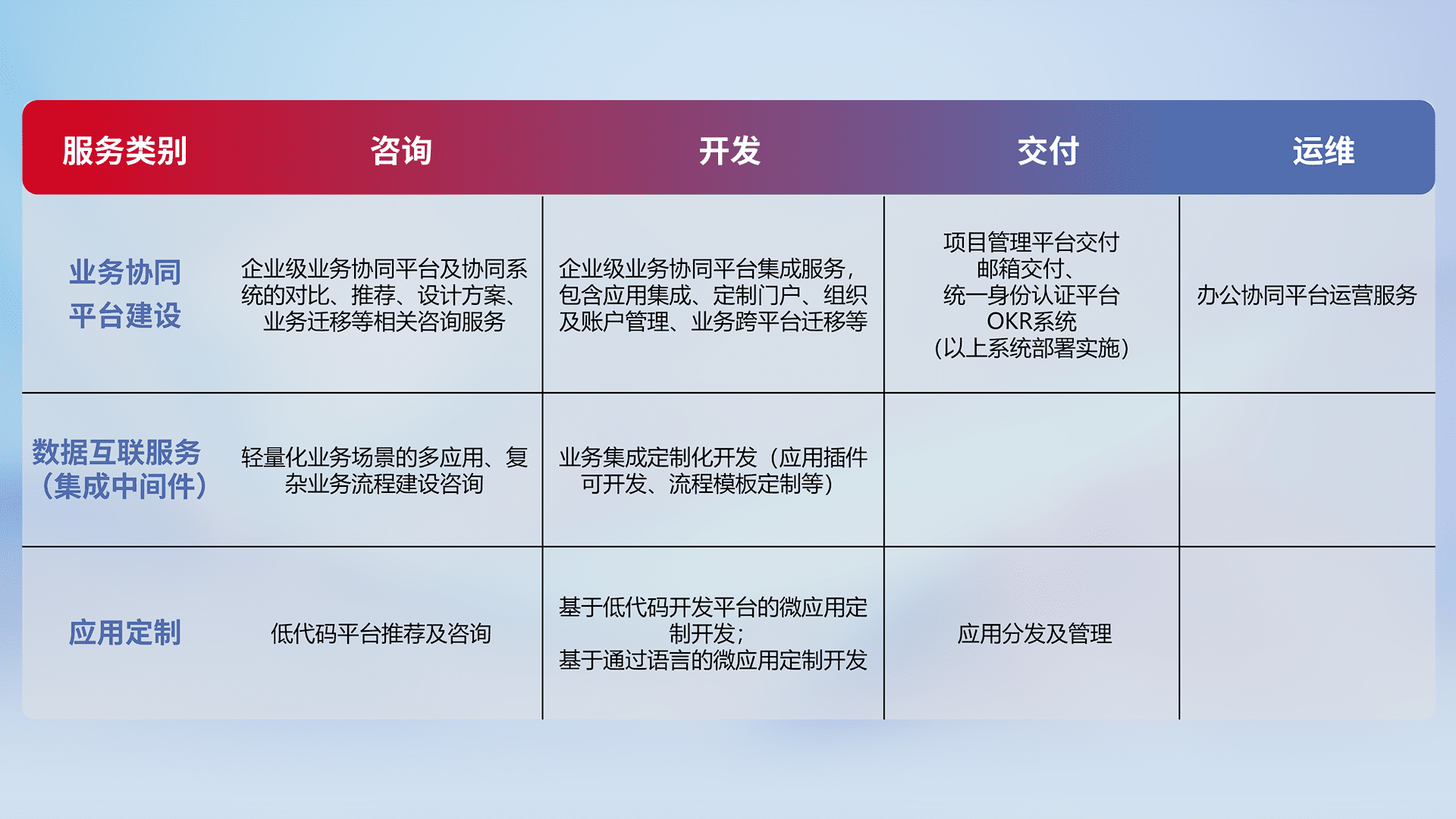 针对钉钉、、、、企微、、IDaas等平台级产品提供产品的规划、、、方案、、、交付、、定制化开发等服务,,,,实现如统一协同办公、、、、智能客户服务、、、、混合会议管理、、、、智能数据查询、、、、等业务场景,,,,实现数字化转型。。
